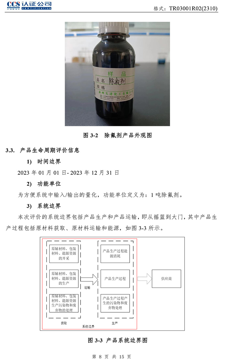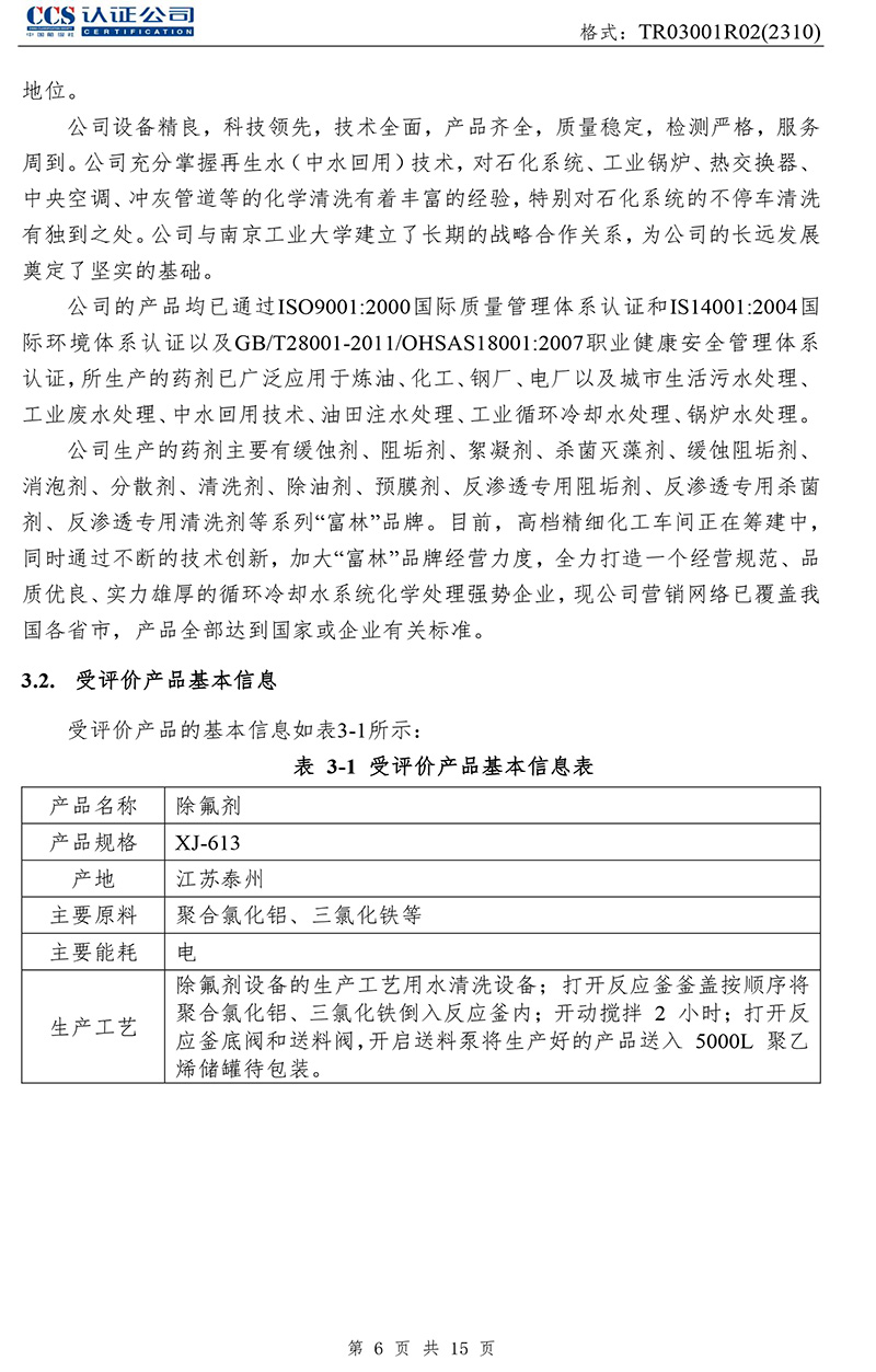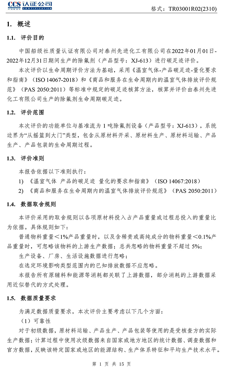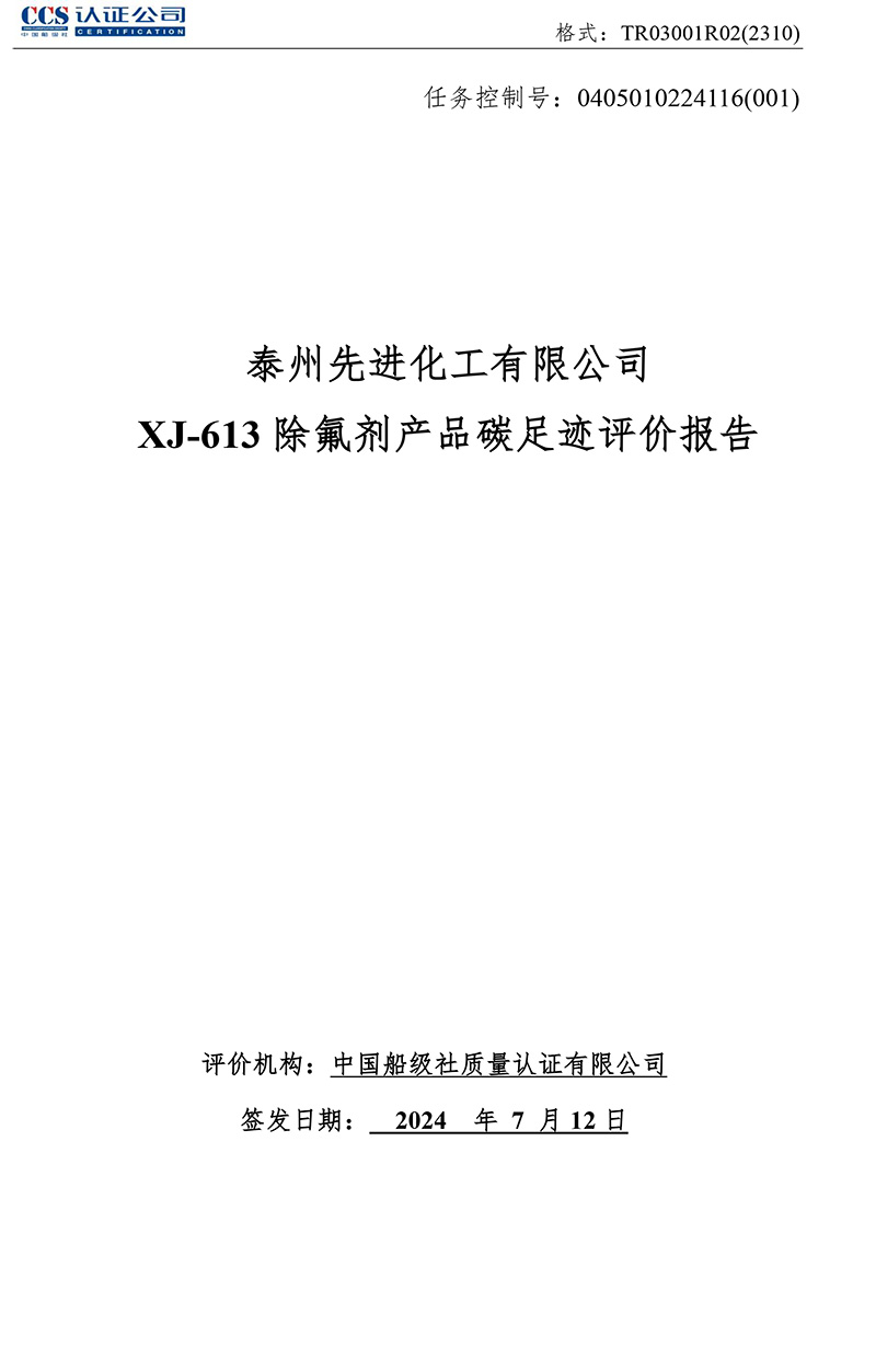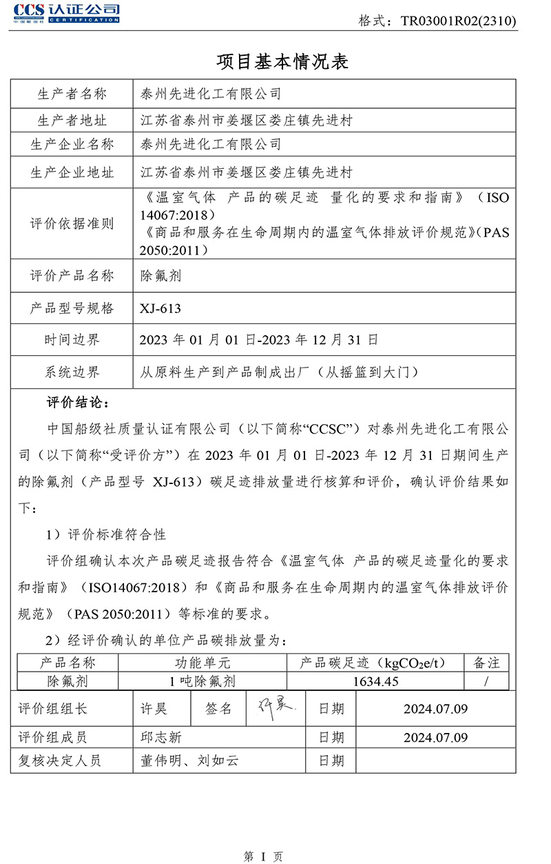 泰州先進(jìn)化工除氟劑產(chǎn)品碳足跡報(bào)告